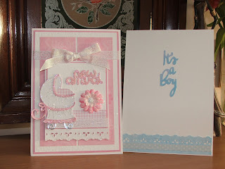 When I saw this basinette on the New Arrival cart I didn't think much of it, so when I wanted to make a baby card with a different cut I thought that I'd give it a go. Boy, am I glad! It's very, very pretty especially when layered & glittered. You could even add broderie anglaise to it and it would be a work of art! I added a little gingham blanket for a little contrast. The layout has been used before and I love it! I used a baby script paper & some gingham paper. The 'broderie anglaise' edge to the front panel was done with a Fiskars border punch. I added glittery white ribbon (left over from Christmas!) & a layered flower. As you can see from the boy version I decorated the inside too.